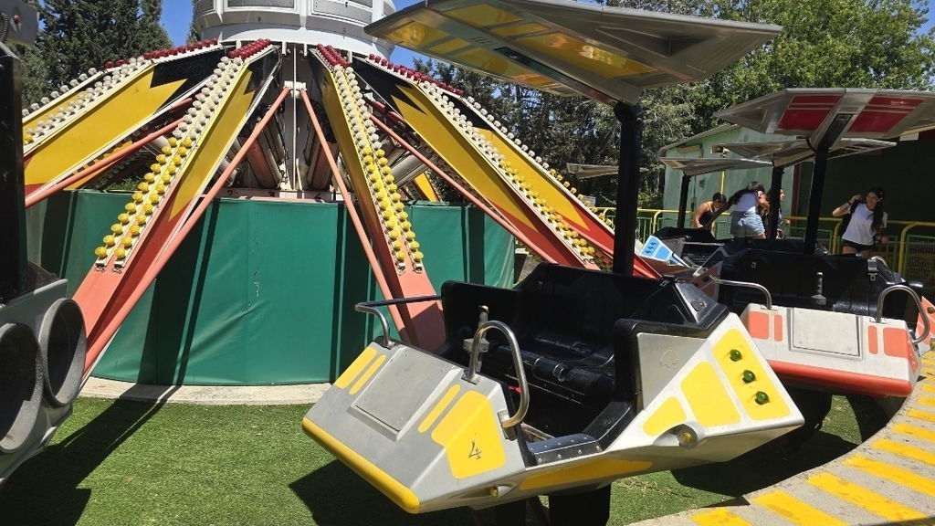Een hoge carrousel met zitjes in de vorm van ruimtevaarders. Je kunt zelf de hoogte en positie van je zitje bepalen.