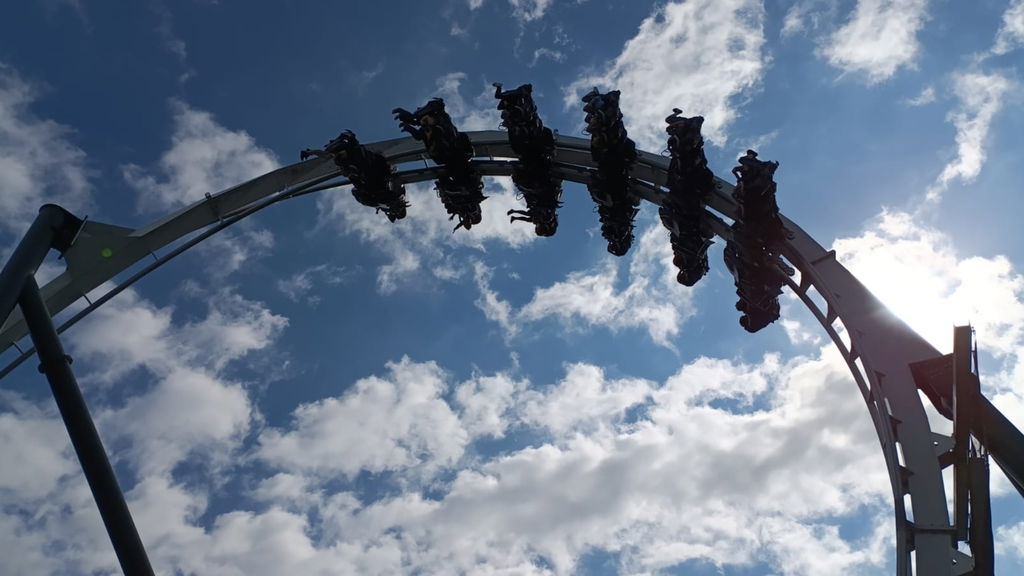 No primeiro wing coaster da Alemanha, você se senta nas asas dos demônios e desliza por 5 inversões.